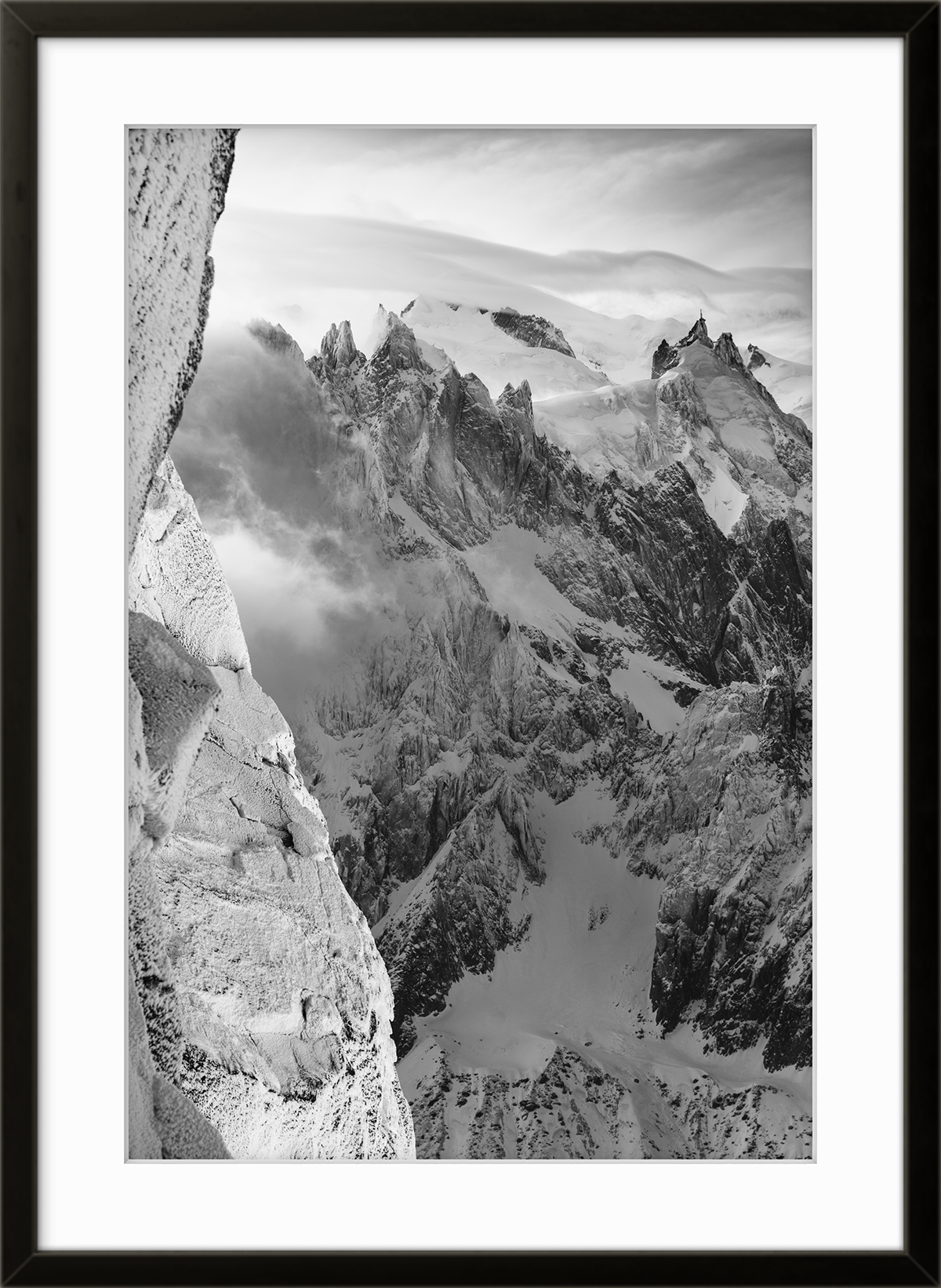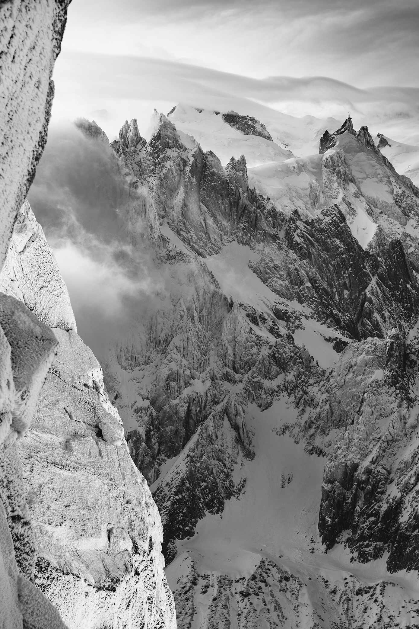 Chamonix war seit Tagen im Unwetter, schneereiche Wolken waren von Norden her vorgerückt und hatten ihre Last über das Massiv geworfen. Als wir die Berge erreichten, war das meiste davon in Nebel gehüllt. Wir haben einige schöne Wendungen in einem weißen Universum namens Grands Montets erlebt. Dann klarte das Wetter auf und ich richtete meine Kamera auf den Berg meines Herzens, die Aiguille du Midi – eingerahmt von den Aiguilles de Chamonix im Vordergrund und dem Mont Blanc – kaum in den Wolken versteckt – im Hintergrund.
