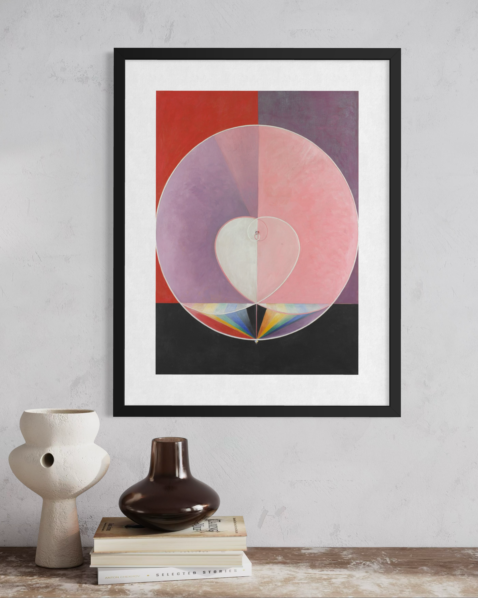 Trykket leveres med refleksfritt glass med UV-beskyttelse. Velg med eller uten passepartout og valgfri farge på listen.