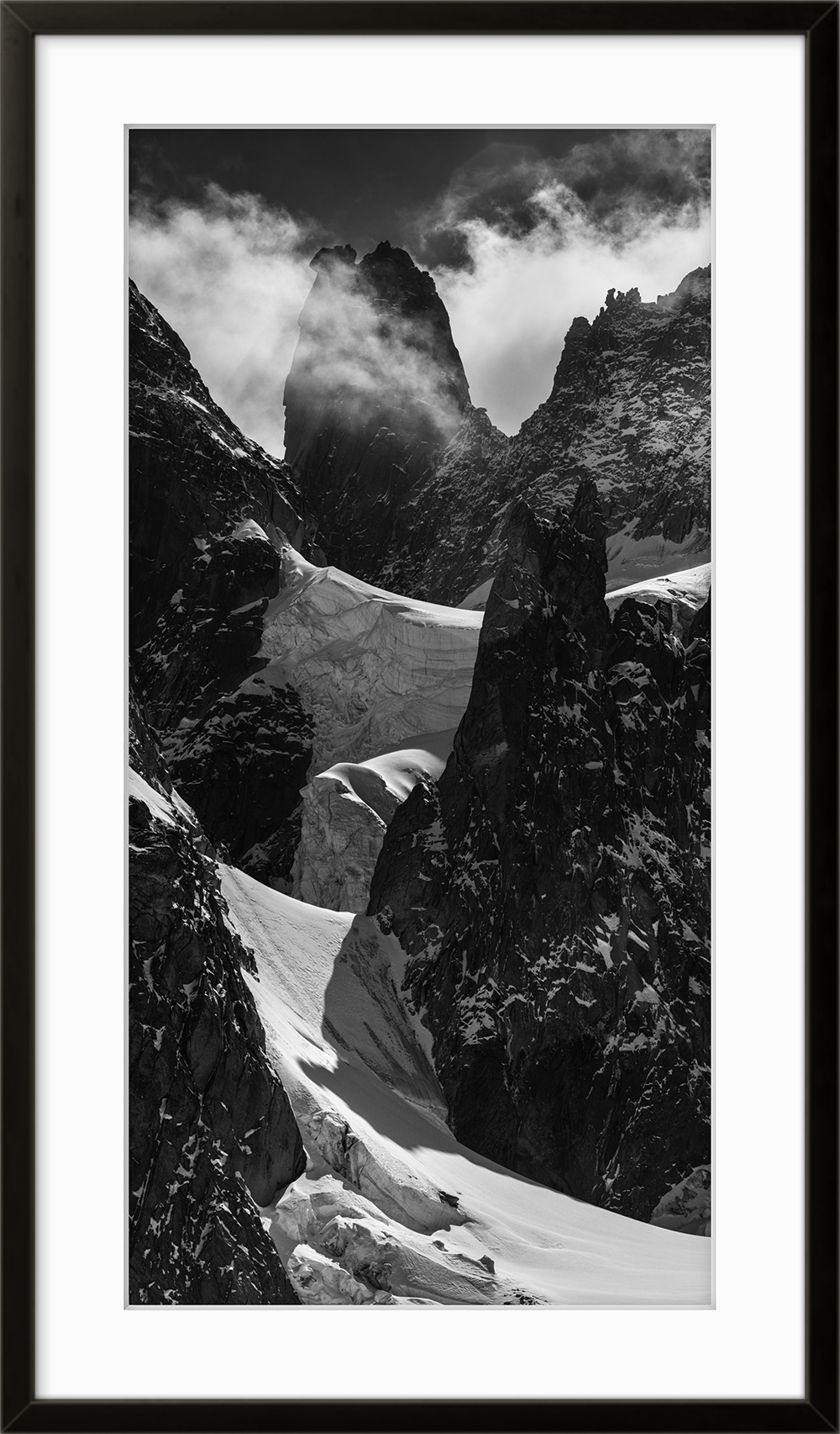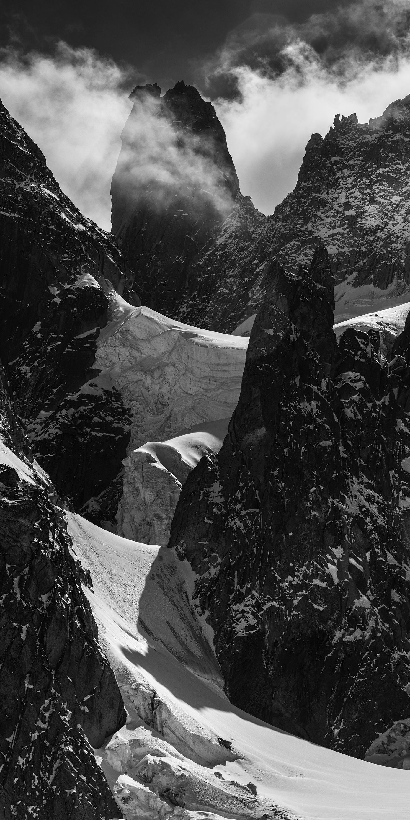 Leading lines can be nice for composing a picture, here the massive white ice leads towards the top. But this line is easier to follow with the eye than with the body, because there are no easy lines to the top on Grand Capucin, you need to level up.